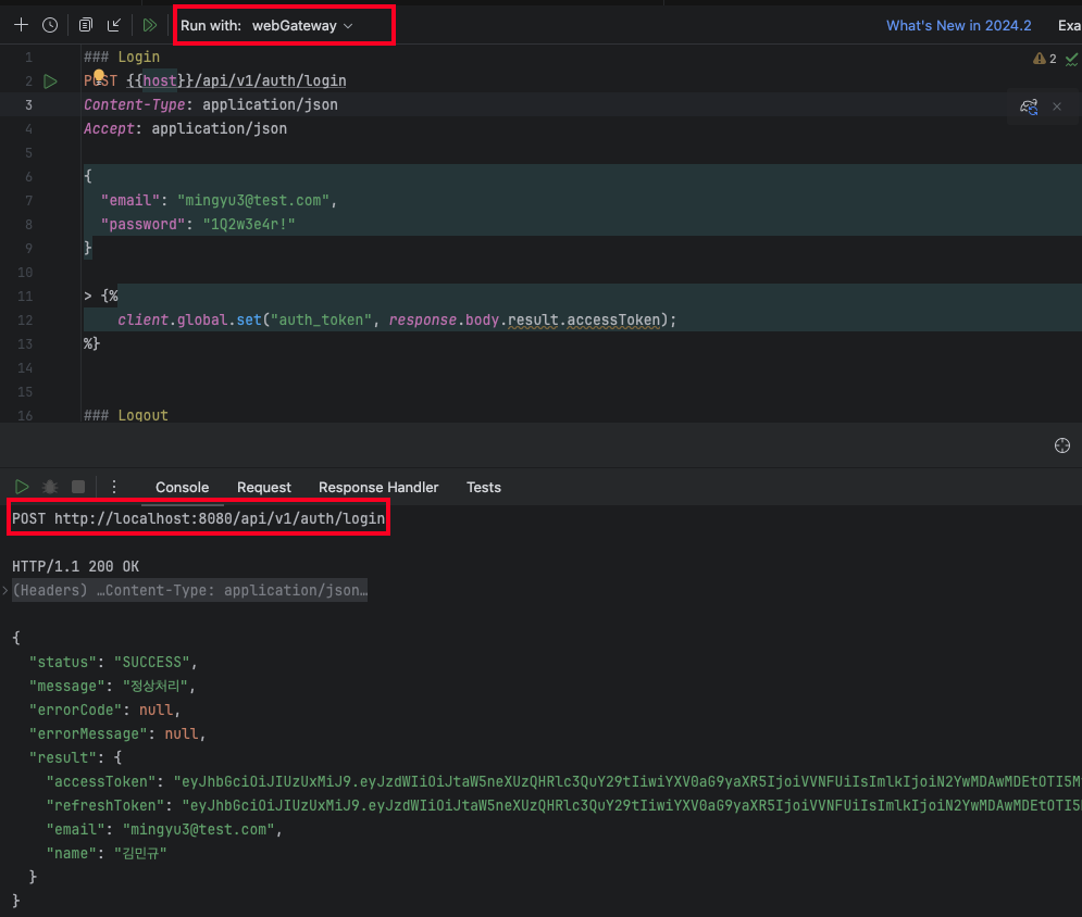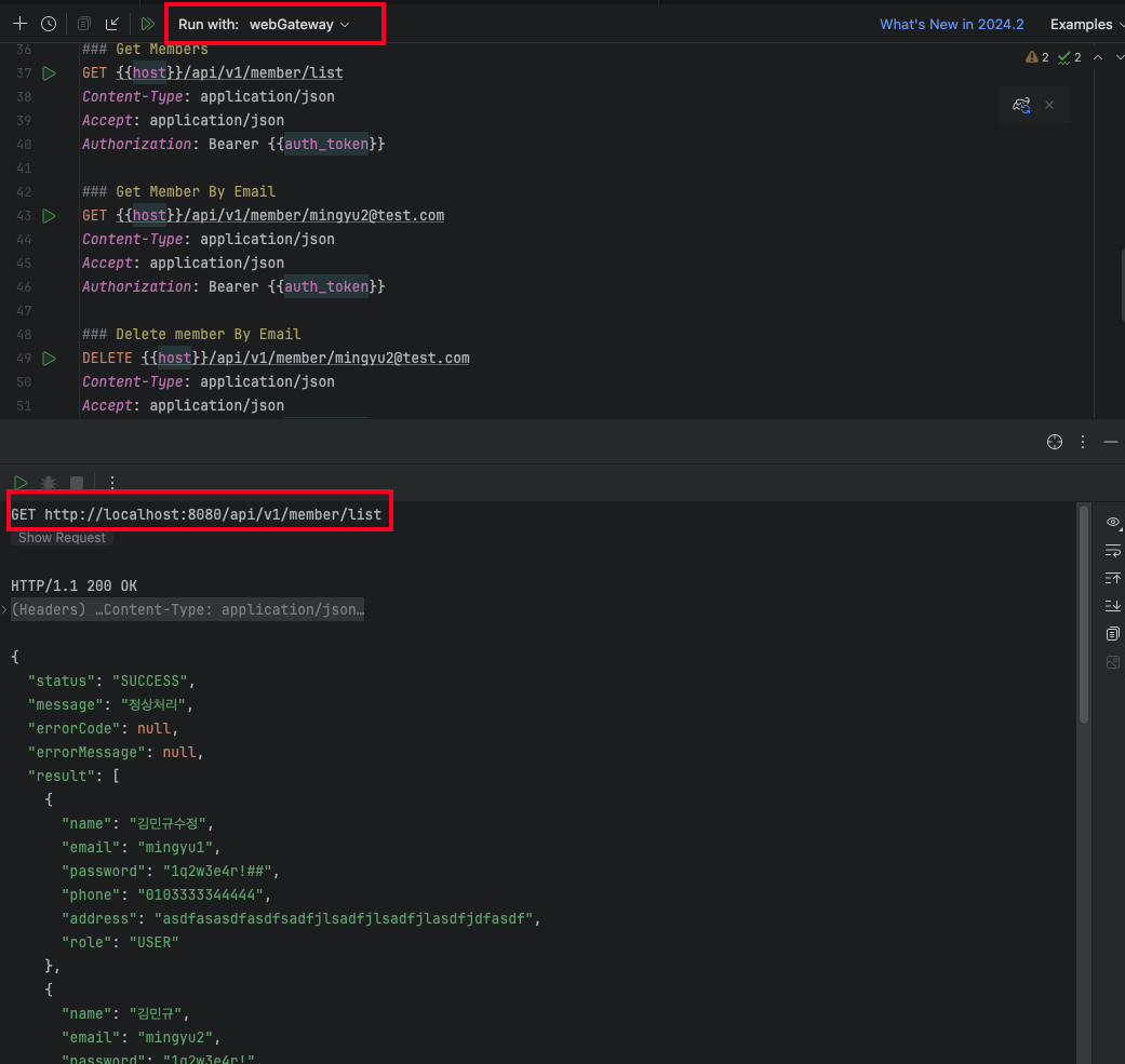마지막으로 Http Request를 통한 실제 API들을 점검해봅니다. host를 webGateway 포트인 8080포트로 지정한 후에 테스트를 진행합니다.