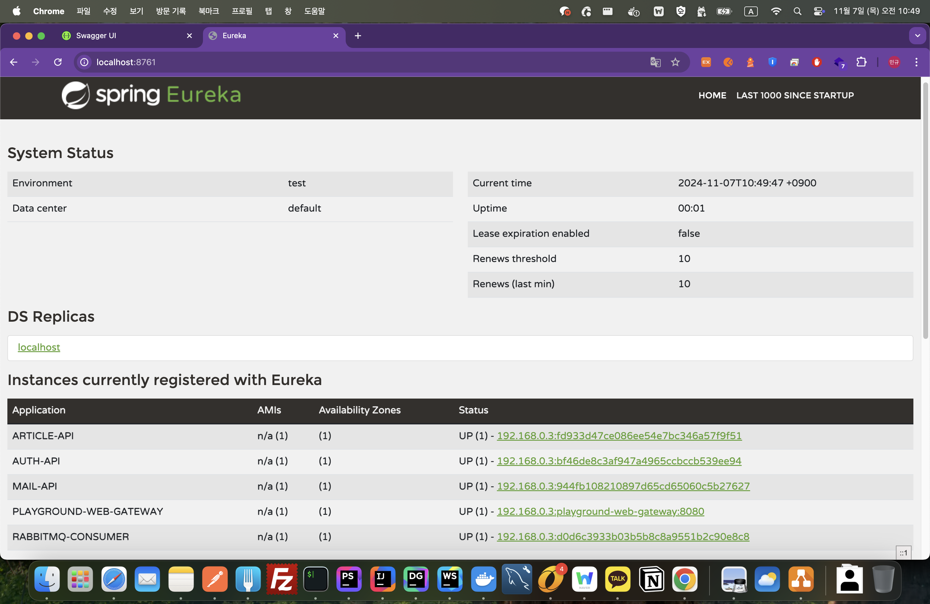 http://localhost:8761 주소로 접속하면 현재 로컬에 구동되어있는 Eureka Server 현황을 확인할 수 있습니다.