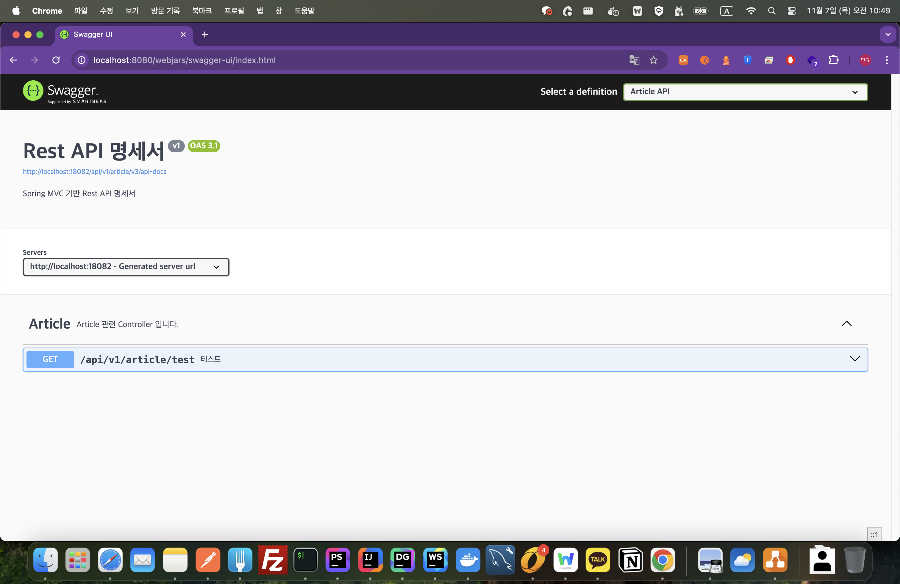 http://localhost:8080/swagger-ui.html 주소로 접속하면 우측 상단에 Select a definition 셀렉트박스를 통해서 구성된 springdocs를 전부 확인할 수 있습니다.