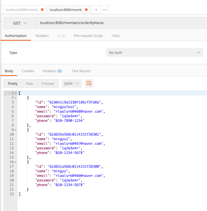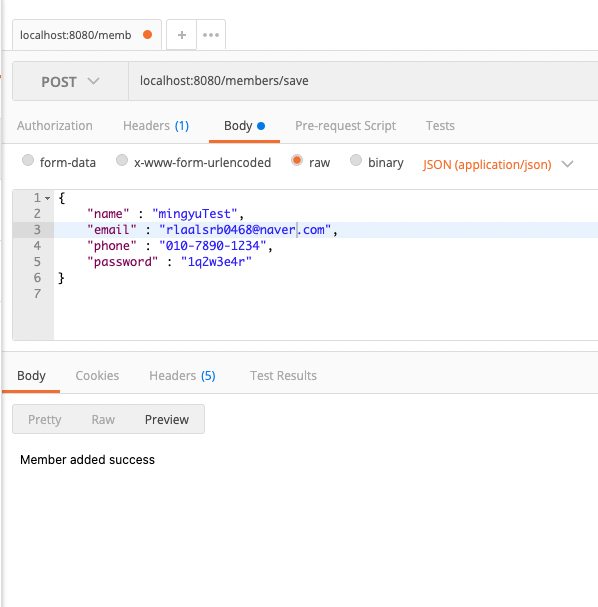 - 멤버 추가 : [POST] localhost:8080/members/save