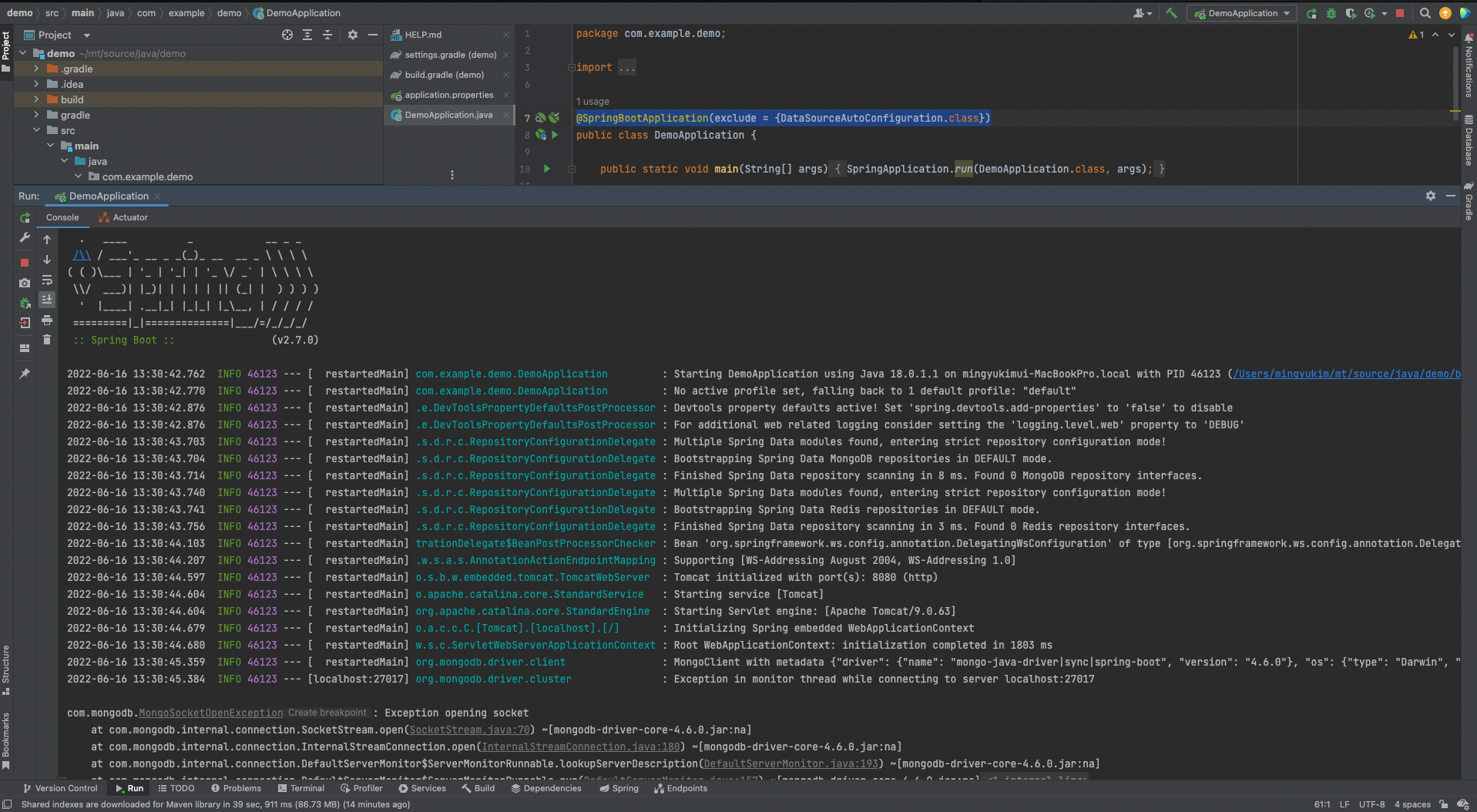 - DB 설정을 하지 않았기 때문에 자동으로 Database를 설정해주는 DataSourceAutoConfiguration Class를 exclude 합니다.
