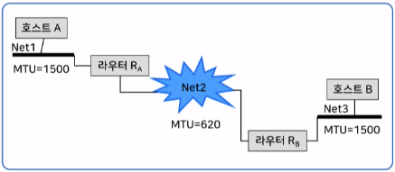 - IP 데이터그램은 전송중 각 네트워크의 MTU에 적합한 크기로 분할되었다가