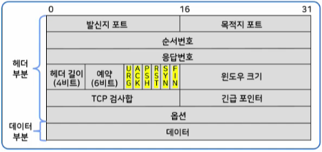 - 6) FIN : 연결을 해제시키기 위해 현재 세그먼트가 마지막 데이터임을 표시할 때 사용.