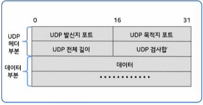 - UDP = 비연결형 IP 전달 서비스 + 검사합(checksum) 기능
