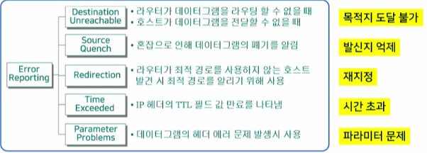 - ICMP는 오류를 수정하지 않고, 단지 보고만 수행한다.